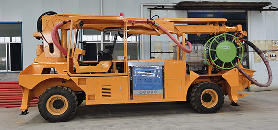 3、同步速凝劑添加采用進口軟管泵,液壓馬達驅(qū)動,電比例流量閥調(diào)節(jié)轉(zhuǎn)速以達到調(diào)節(jié)流量的目的,液晶顯示和觸屏設置速凝劑添加比例,且在屏幕和器上均可隨時修改設置,速凝劑的添加量緊隨砼的泵送量同步變化而保持添加比例按設定值運行,這些均由可編程控制器控制。由此可實現(xiàn)對速凝劑添加量的控制,以達到效果,回彈和節(jié)約速凝劑的目的。機器上配有容積為1.0m³的耐腐蝕塑料材質(zhì)的速凝劑容器,速凝劑軟管泵也可從外部容器中抽吸速凝劑,根據(jù)實際情況可方便地進行切換。